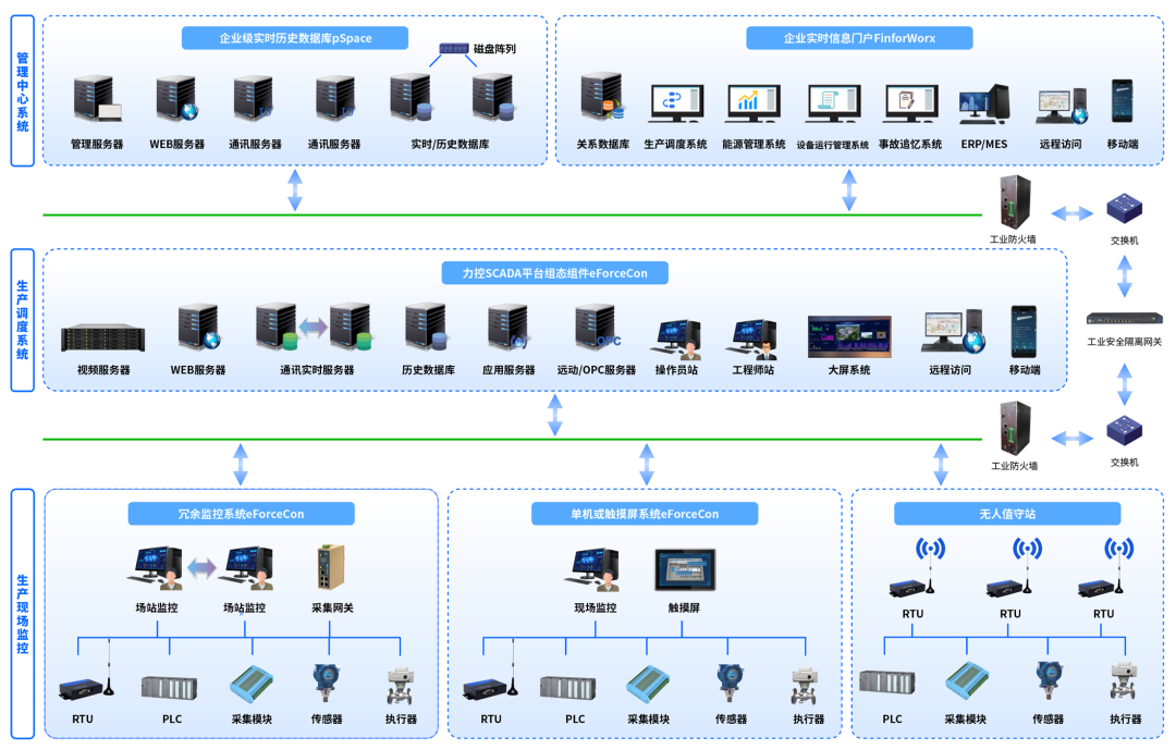 從產(chǎn)業(yè)鏈安全角度看,SCADA平臺(tái)支持全國(guó)產(chǎn)化技術(shù)棧,與主流操作系統(tǒng)、CPU及主機(jī)、PLC等設(shè)備廠商完成了兼容認(rèn)證,可在異構(gòu)平臺(tái)混合交叉部署。從外部防護(hù)角度看,力控科技關(guān)注工控系統(tǒng)本質(zhì)安全,依托自主的工業(yè)防火墻、安全隔離網(wǎng)關(guān)、安全審計(jì)等防護(hù)產(chǎn)品形成了成熟的工控信息安全方案。