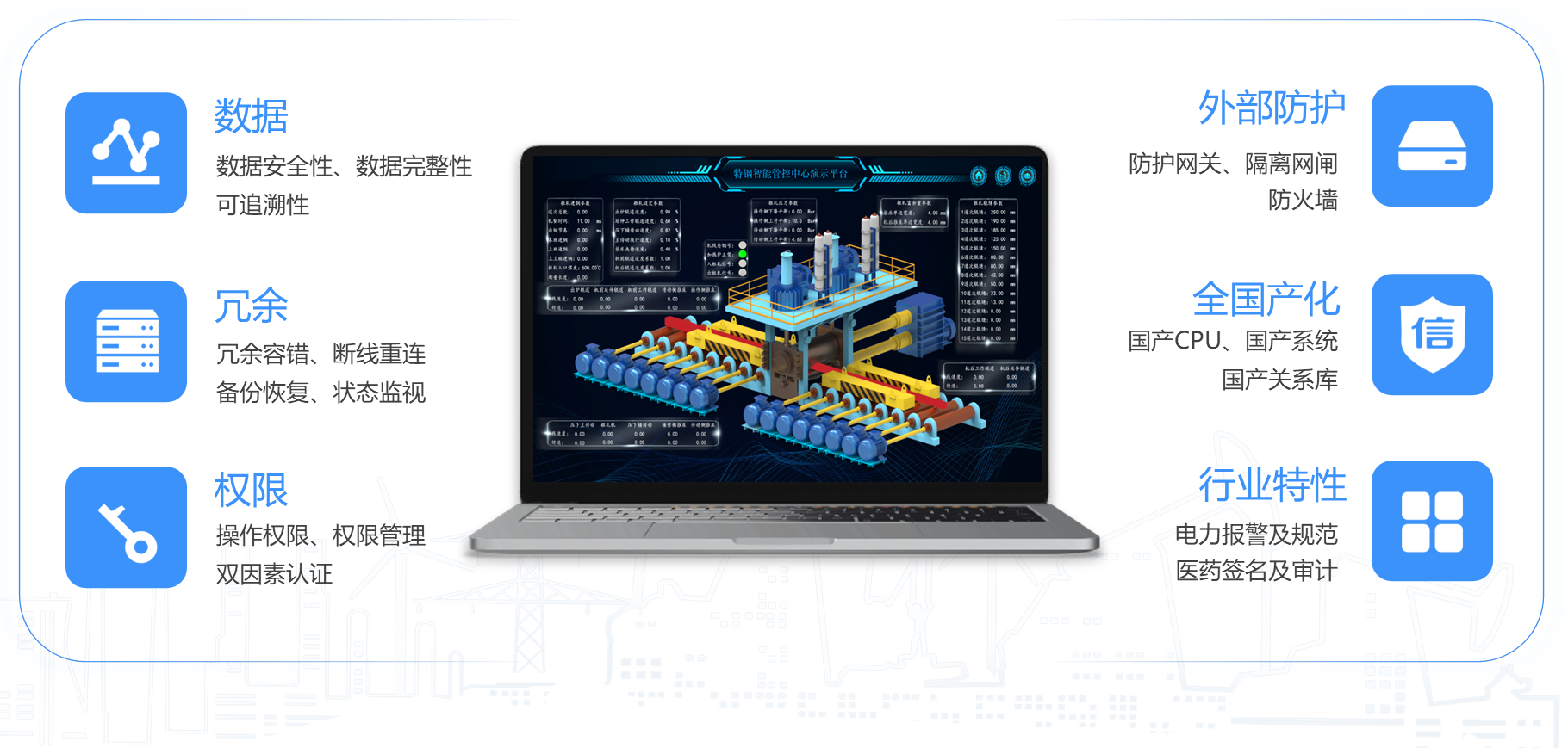 針對(duì)逐步升級(jí)的挑戰(zhàn),力控科技提出的SCADA 系統(tǒng)安全防護(hù)設(shè)計(jì)方案兼顧內(nèi)生安全與外部防護(hù)。工業(yè)SCADA平臺(tái)軟件遵循GB 40050-2021網(wǎng)絡(luò)關(guān)鍵設(shè)備安全通用要求等系列標(biāo)準(zhǔn)規(guī)范,提供了適合大型分布式系統(tǒng)場(chǎng)景的冷溫?zé)崛哂?、多?jí)權(quán)限、用戶身份標(biāo)識(shí)與鑒別、測(cè)點(diǎn)級(jí)訪問控制、防重放攻擊的通信安全、日志審計(jì)、電子簽名、備份恢復(fù)、異常檢測(cè)等一系列安全機(jī)制。