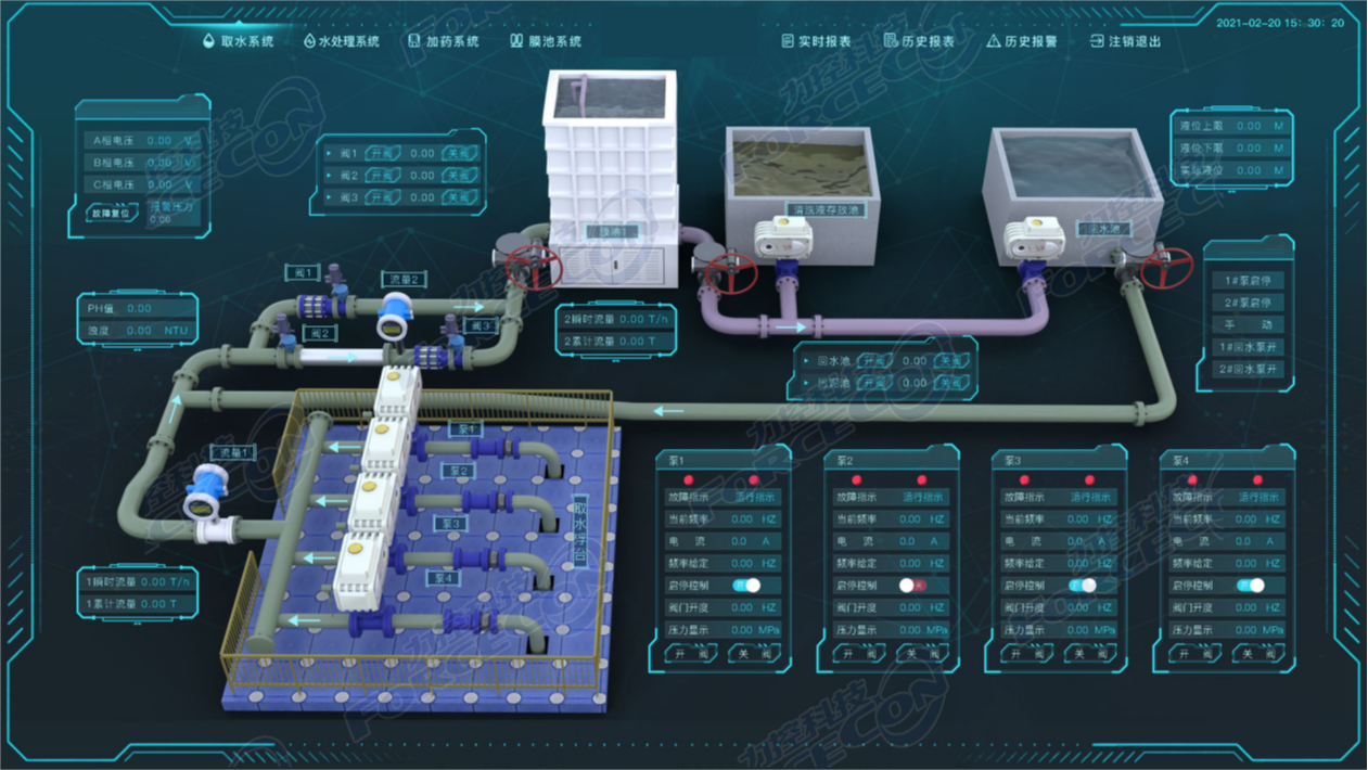 該水廠數(shù)字化改造前,其生產(chǎn)流程基本上實現(xiàn)了機械化的覆蓋,但是運行人員仍承受者較大的勞動強度,每次設(shè)備的運行、保養(yǎng)、維護(hù)都需要大量的人工記錄和計算,工作效率普遍低下。為提高整體效率,企業(yè)進(jìn)行了本次SCADA系統(tǒng)的建設(shè)。本SCADA系統(tǒng)建設(shè)主要包括對水廠當(dāng)前所擁有的取水系統(tǒng)、水處理系統(tǒng)、加壓系統(tǒng)和供水系統(tǒng)等四個子系統(tǒng)進(jìn)行整合,形成一套完備的綜合水處理系統(tǒng)。該系統(tǒng)主要實現(xiàn)了對生產(chǎn)過程中的液位、壓力、流量等各子系統(tǒng)的生產(chǎn)參數(shù)的實時監(jiān)測,確保了生產(chǎn)的安全穩(wěn)定運行,同時可以實現(xiàn)對泵、閥門、變頻器等設(shè)備的遠(yuǎn)程實時控制,提高了工作人員的操作效率,并節(jié)約了人工成本,降低了設(shè)備故障導(dǎo)致的停產(chǎn)所造成的經(jīng)濟(jì)損失,使水廠的生產(chǎn)管理從本地控制轉(zhuǎn)向全廠集中控制。
